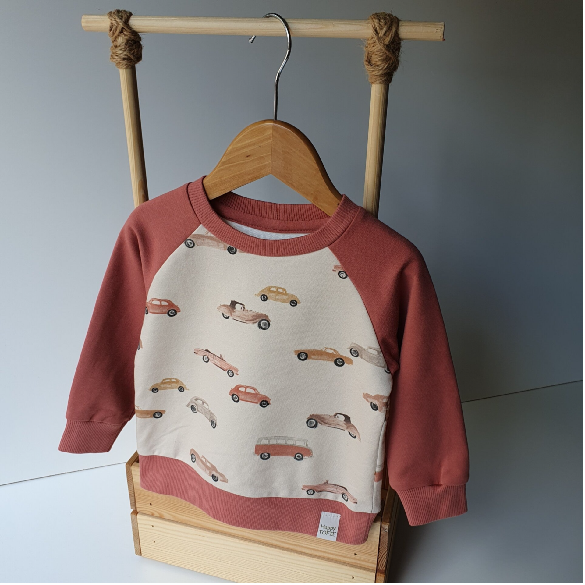 Vrolijke zachte sweater met vintage cars red print en licht mahonie mouwen