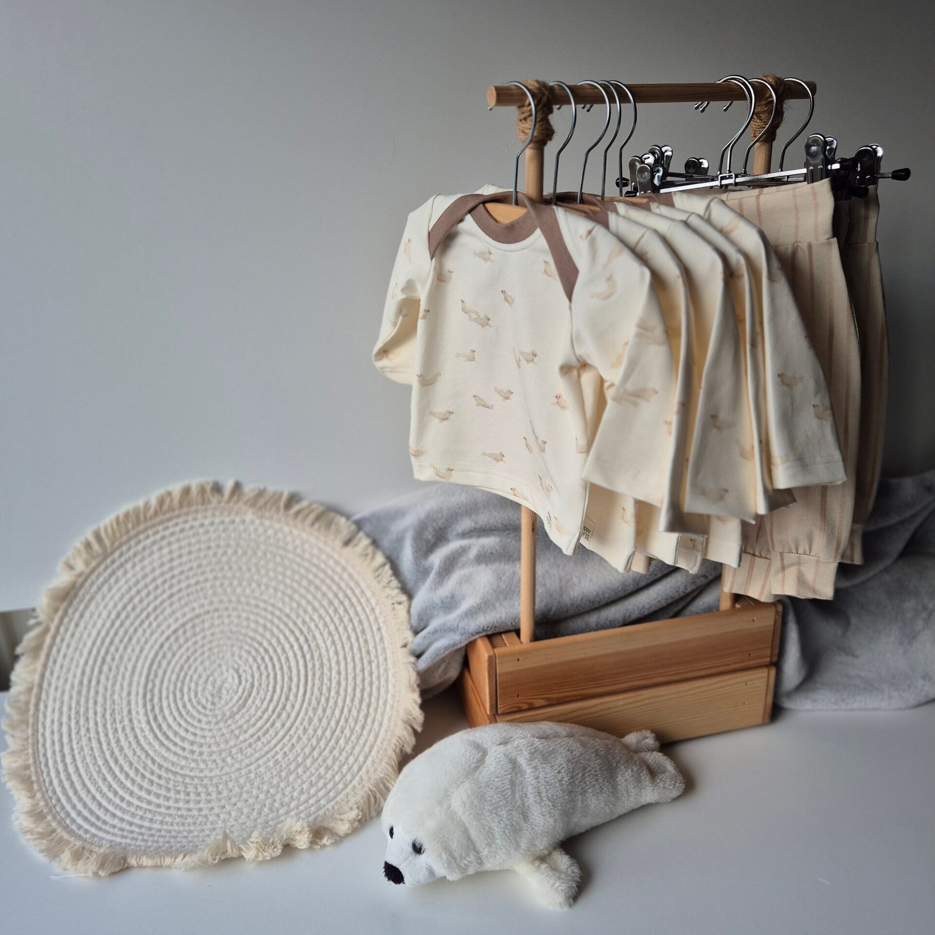 Broek gemaakt van zachte tricotstof met een meerekkende tailleband. Er zit geen elastiek in de tailleband voor het zo comfortabel mogelijk dragen tijdens het eerste levensjaar.