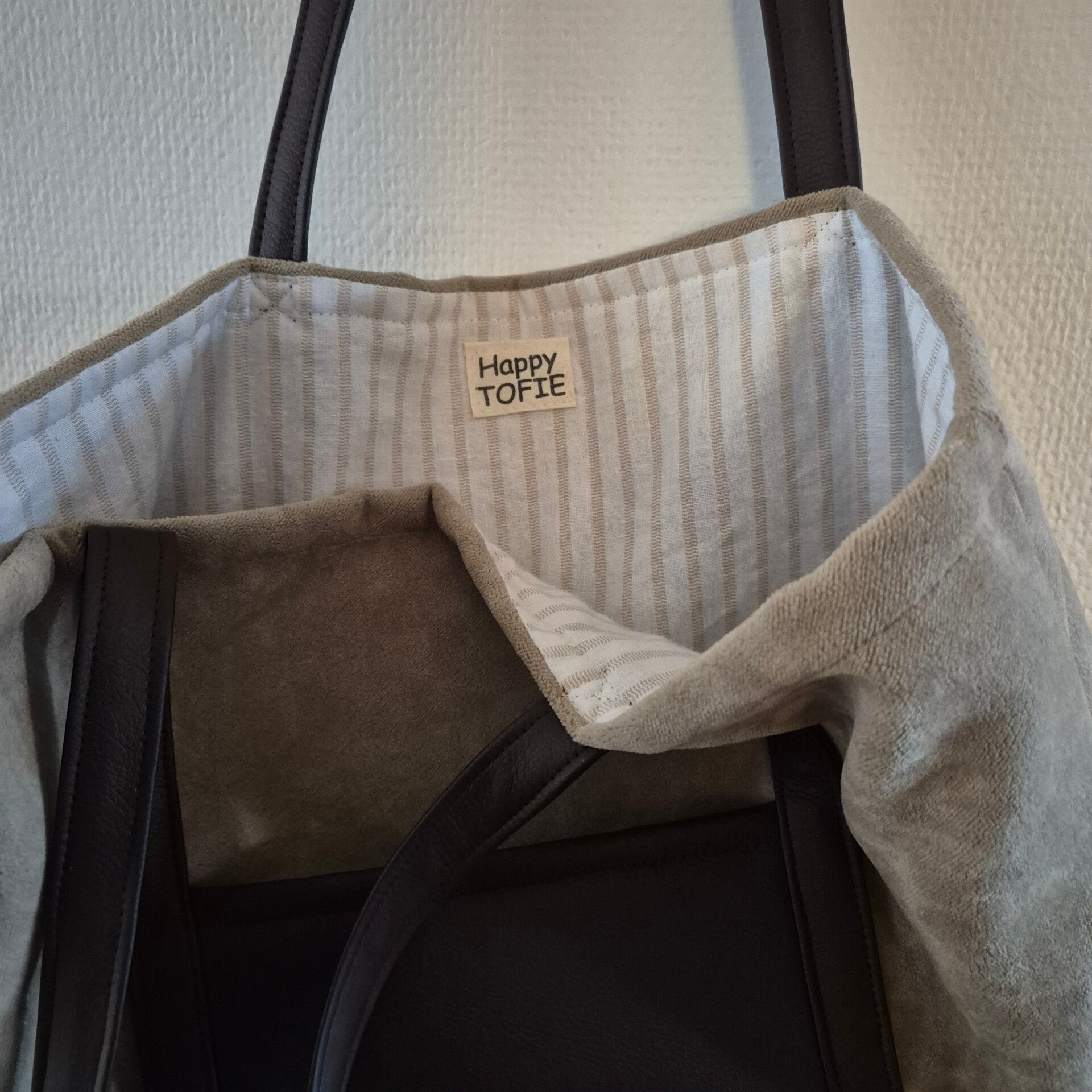 De totebag is gemaakt van een prachtige meubelstof en gevoerd met een bijpassende streepjes stof.