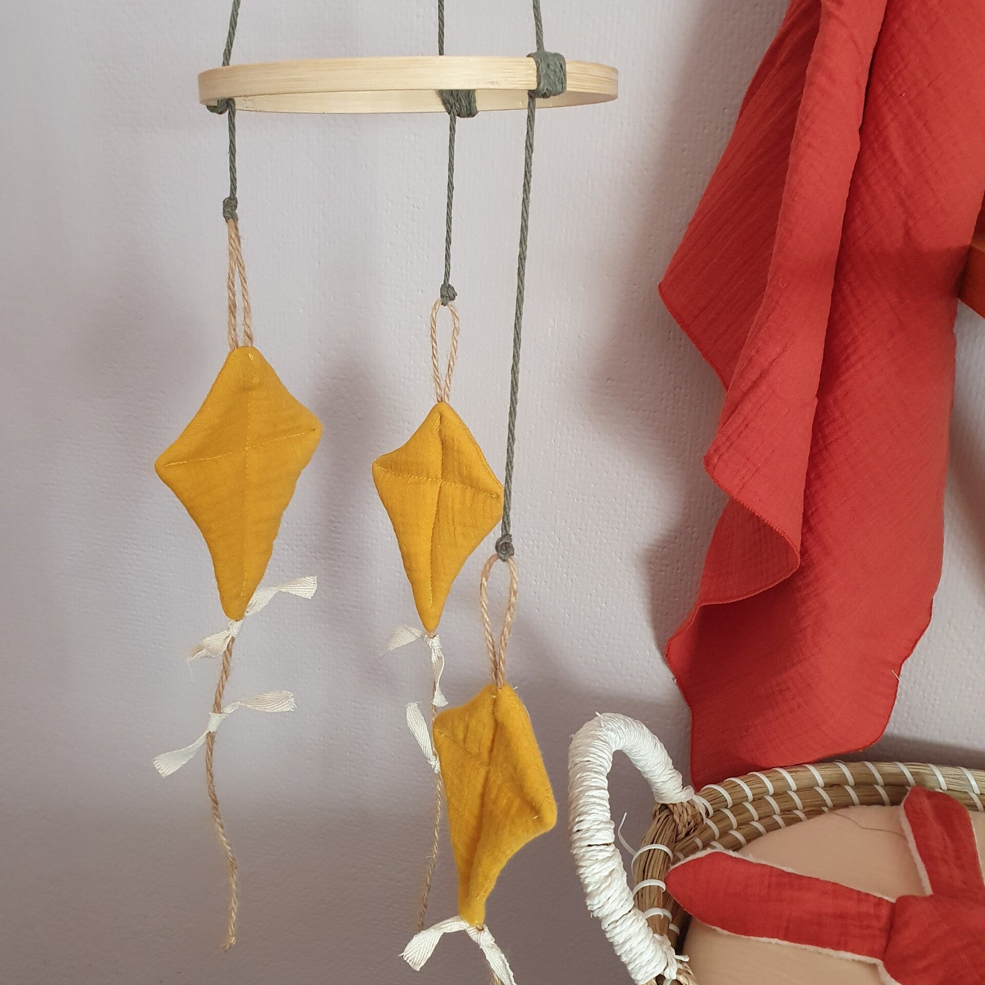 Mobiel van een bamboering met een diameter van 15,5 cm. De okergele vliegertjes zijn ca. 7,5 x 12,5 cm. De vliegers zijn van hydrofiel stof gemaakt en gevuld. De strikjes zijn van katoenband